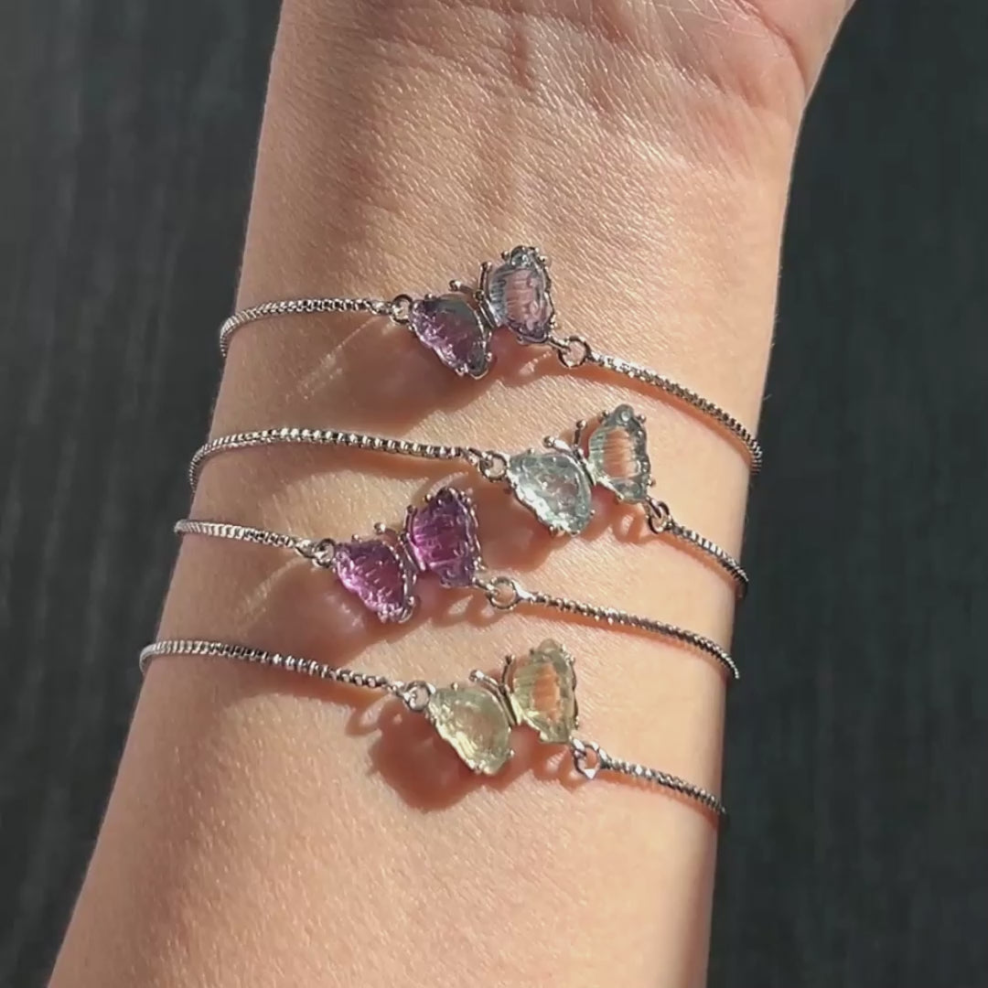 Carved Rainbow Fluorite in Butterfly Adjustable Silver Bracelet